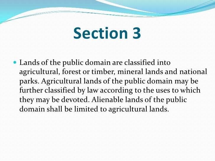 - . Section 3<br />Lands of the public domain are classified into agricultural, forest or timber, mineral lands and national parks. Agricultural lands of the public domain may be further classified by law according to the uses to which they may be devoted. Alienable lands of the public domain shall be limited to agricultural lands.<br />