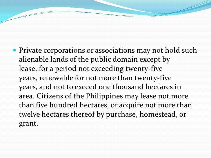 - . Private corporations or associations may not hold such alienable lands of the public domain except by lease, for a period not exceeding twenty-five years, renewable for not more than twenty-five years, and not to exceed one thousand hectares in area. Citizens of the Philippines may lease not more than five hundred hectares, or acquire not more than twelve hectares thereof by purchase, homestead, or grant. <br />
