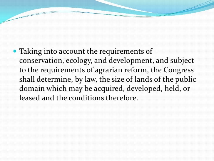 - . Taking into account the requirements of conservation, ecology, and development, and subject to the requirements of agrarian reform, the Congress shall determine, by law, the size of lands of the public domain which may be acquired, developed, held, or leased and the conditions therefore. <br />