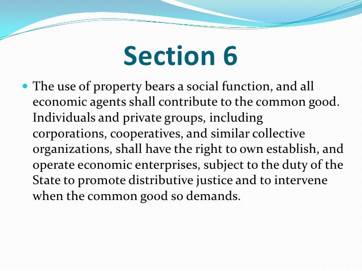 - . Section 6<br />The use of property bears a social function, and all economic agents shall contribute to the common good. Individuals and private groups, including corporations, cooperatives, and similar collective organizations, shall have the right to own establish, and operate economic enterprises, subject to the duty of the State to promote distributive justice and to intervene when the common good so demands. <br />