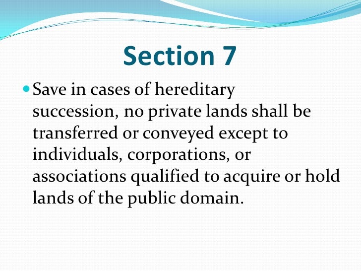- Section 7The State shall regulate or prohibit monopolies when the public interest so requires. No combinations in restraint of trade or unfair competition shall be allowed<br />Save in cases of hereditary succession, no private lands shall be transferred or conveyed except to individuals, corporations, or associations qualified to acquire or hold lands of the public domain. <br />
