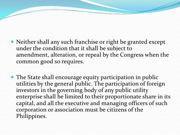 - . Neither shall any such franchise or right be granted except under the condition that it shall be subject to amendment, alteration, or repeal by the Congress when the common good so requires.<br />The State shall encourage equity participation in public utilities by the general public. The participation of foreign investors in the governing body of any public utility enterprise shall be limited to their proportionate share in its capital, and all the executive and managing officers of such corporation or association must be citizens of the Philippines. <br />
