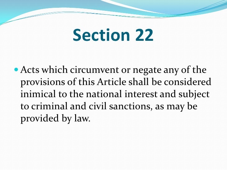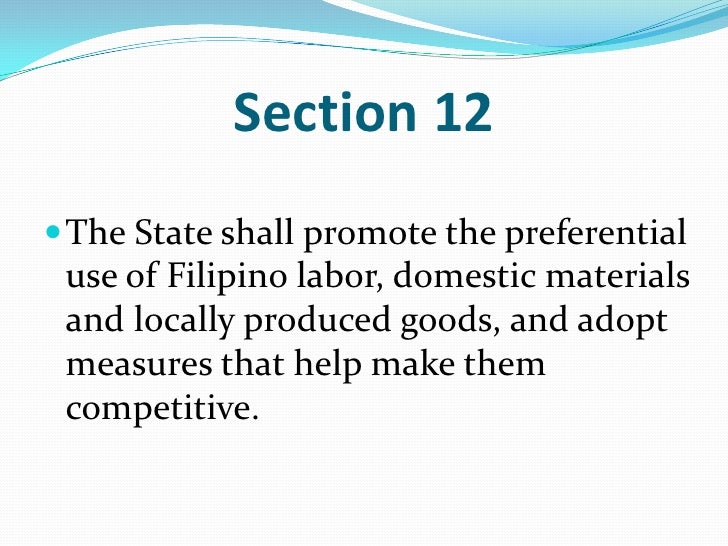- Section 22The State shall promote the preferential use of Filipino labor, domestic materials and locally produced goods, and adopt measures that help make them competitive.<br />Acts which circumvent or negate any of the provisions of this Article shall be considered inimical to the national interest and subject to criminal and civil sanctions, as may be provided by law.