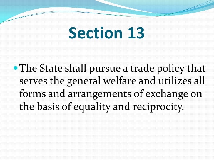 - . Section 13<br />The State shall pursue a trade policy that serves the general welfare and utilizes all forms and arrangements of exchange on the basis of equality and reciprocity. <br />The Congress may, by law, allow small-scale utilization of natural resources by Filipino citizens, as well as cooperative fish farming, with priority to subsistence fishermen and fishworkers in rivers, lakes, bays, and lagoons.