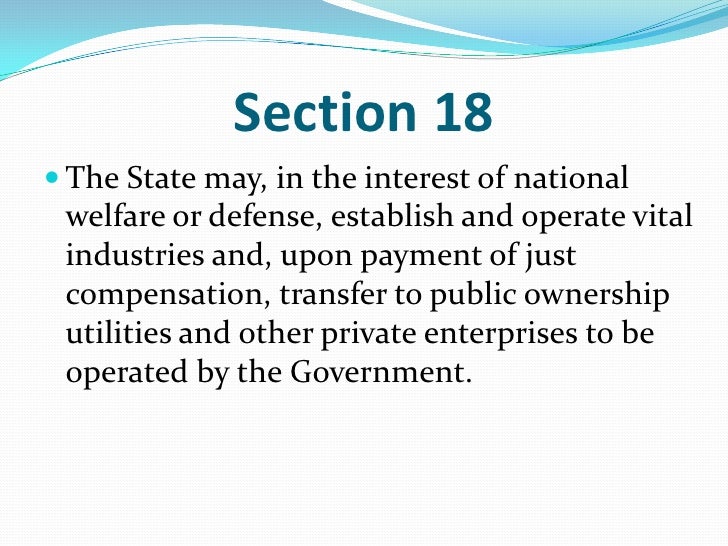 - . Section 18<br />The State may, in the interest of national welfare or defense, establish and operate vital industries.