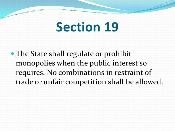 - . Section 19<br />The State shall regulate or prohibit monopolies when the public interest so requires. No combinations in restraint of trade or unfair competition shall be allowed. No combinations in restraint of trade or unfair competition shall be allowed. <br />