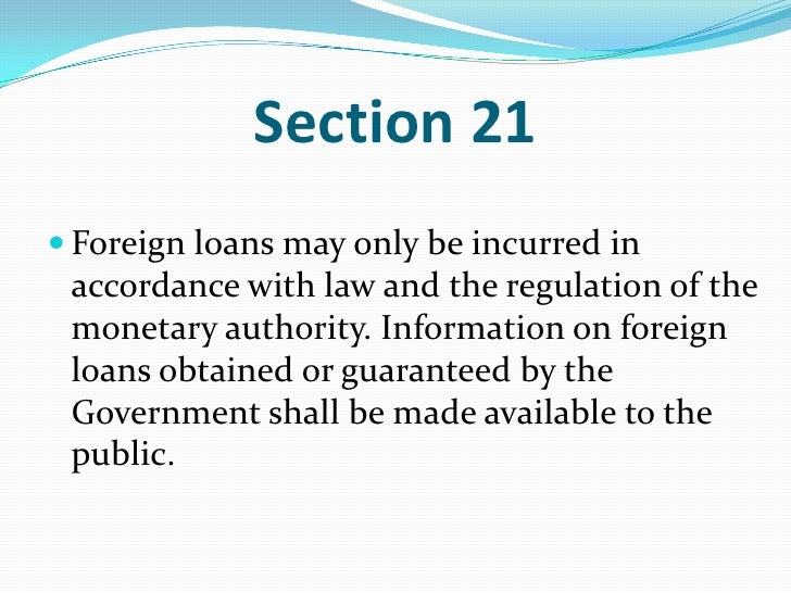 - Section 21<br />Foreign loans may only be incurred in accordance with law and the regulation of the monetary authority. Information on foreign loans obtained or guaranteed by the Government shall be made available to the public. <br />